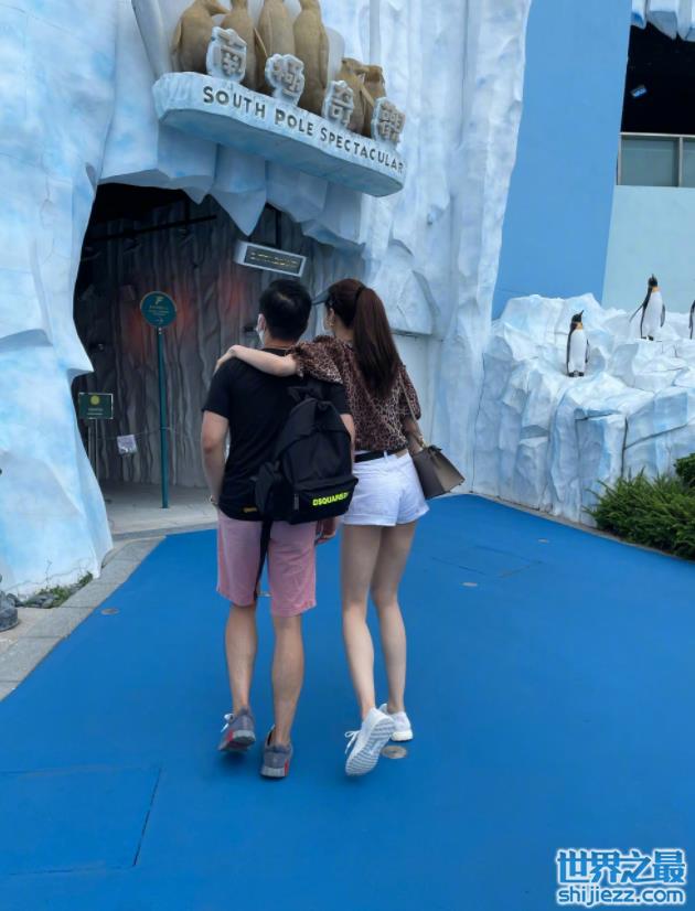 照片中,熊黛林穿着一件豹纹上衣搭配一条白色超短裤好身材尽显,一旁的老公则穿着黑色T恤和粉色短裤十分休闲。只见熊黛林一只手自然地搭在老公肩上,两人看上去十分亲密,熊黛林看起来比老公还要高一点。