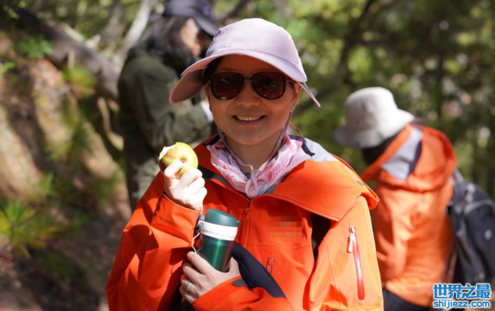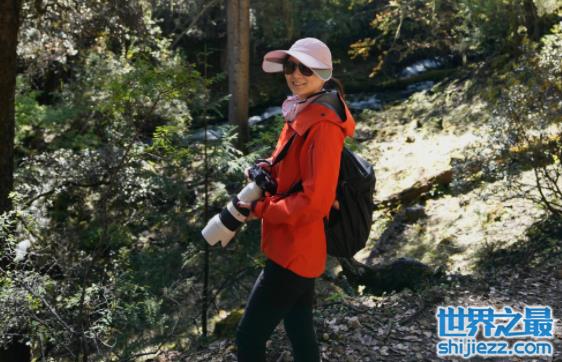 画面中陈婷扎着马尾辫,身穿一件橙色外套搭配黑色紧身长裤,勾勒出双腿的曲线美。她与众多好友结伴向大山高处前行,手持摄影机姿势专业,对准对岸的美景记录下美丽时刻。