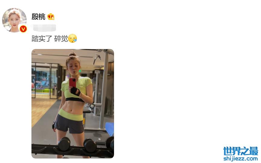她穿着短衣短裤的健身服,漂亮的直角肩和小蛮腰上清晰的马甲线显露无遗,手上戴着无指手套,拿着手机美美地对镜自拍,手腕上的银色手链十分抢眼。殷桃配文表示,运动完踏实了,才好睡觉。看来日常健身已经成了她的习惯。