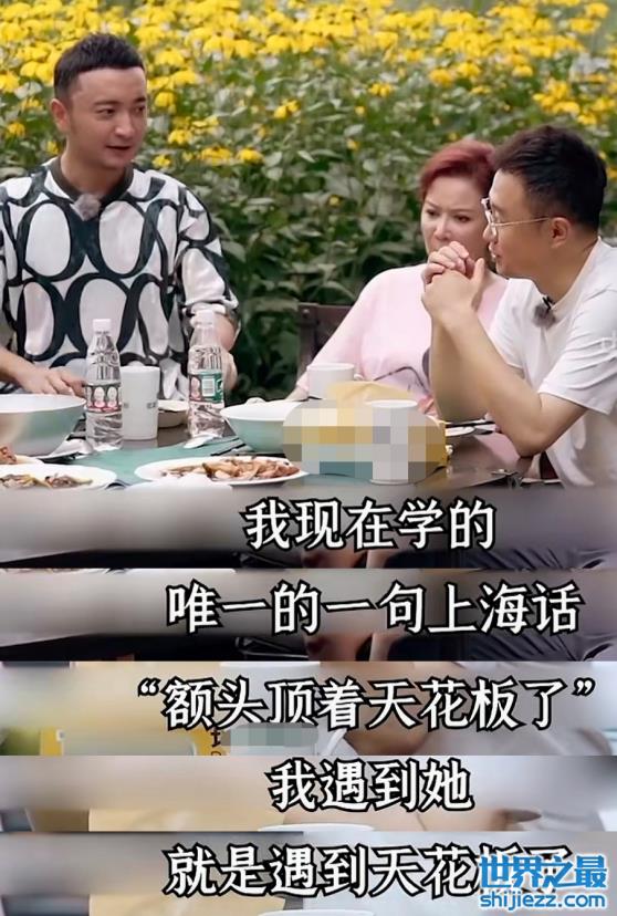 刚强自曝自己学会的唯一一句上海话就是“额头顶着天花板了”,翻译成普通话意思是遇着天花板了,暗示遇见老婆春妮是运气爆棚了,让众人吃饱了狗粮。