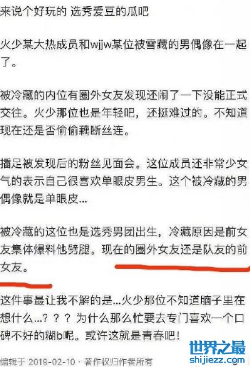 而早在2019年,就已经有爆料称火少大热成员与哇唧唧哇一个被雪藏的男偶像在一起了,被雪藏的男偶像有圈外女友,而男偶像被雪藏的原因是前女友集体爆料他劈腿,现任圈外女友还是队友的前女友。