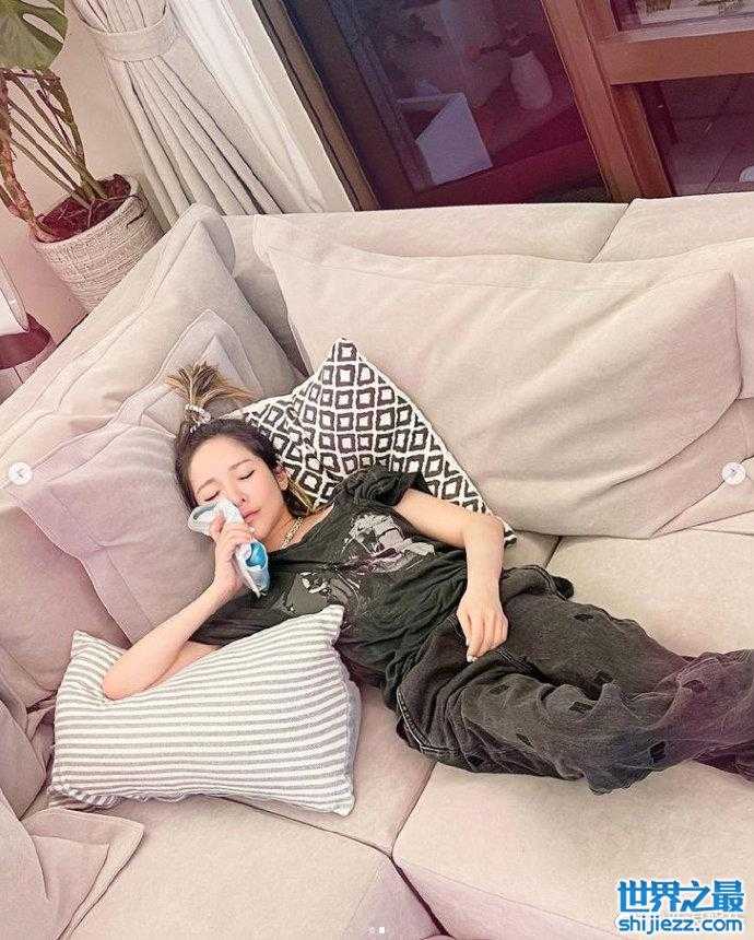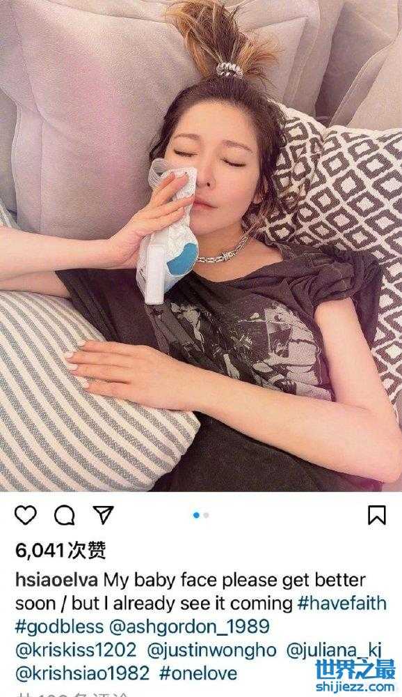 分享动态的萧亚轩晒出自己的全新自拍照,照片中的她躺在豪华沙发上面,然后手拿冰袋敷伤口,闭着眼睛,看起来气色不错。