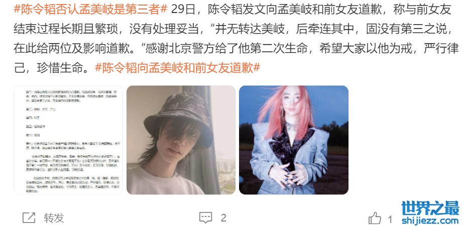 近日,陈令韬跟孟美岐的事件不断在发酵中。陈令韬也在社交平台删除了之前所谓的“遗书”再次发文道歉,表示孟美岐并不是第三者,同时也向被卷入事件的两位女生道歉。