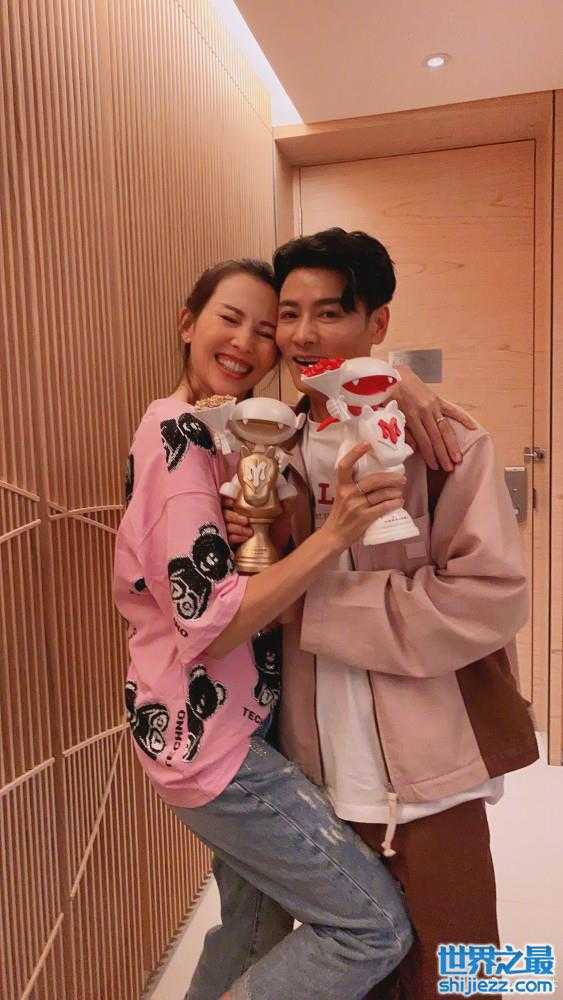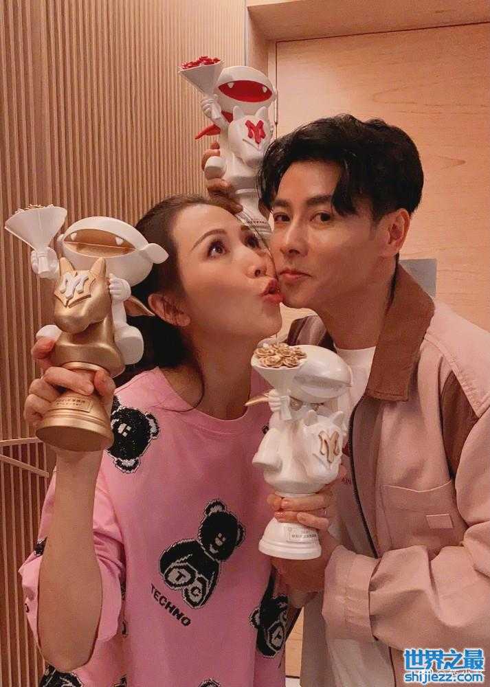 晒出的照片中,两人对着镜头深情亲吻着,蔡少芬一只手勾住张晋的脖子,另一只手则放到了张晋脸蛋上,张晋也给予回应,一手扶着老婆后背一手扶住胳膊,这亲吻的姿势可以打满分了,而另一张亲吻照则是拿着奖杯一起,嘴对嘴的画面好甜。