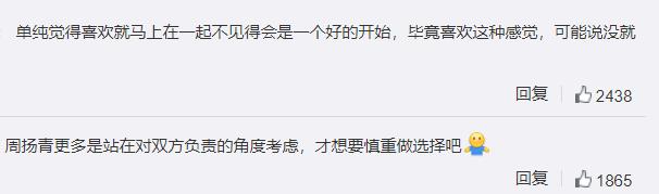 周扬青也正是因为想要对双方负责、对感情负责,所以才会觉得需要和对方足够了解之后再开始恋情,三个月只是一个大概时间,而不是定数,这个时间会因为对对方的了解深入而变短或延长。