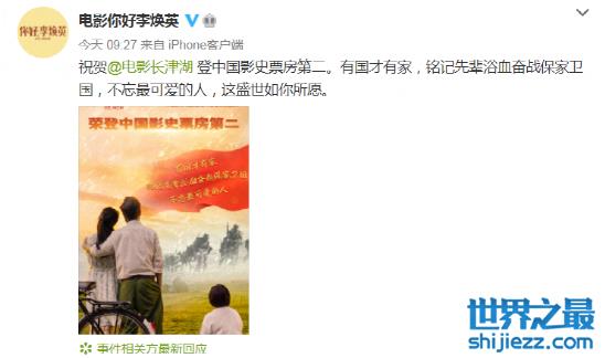 《长津湖》刚刚突破票房第二记录,原本的记录保持者《李焕英》官博就发文祝贺,还特别制作了一张祝贺海报。