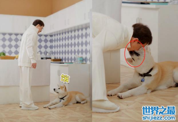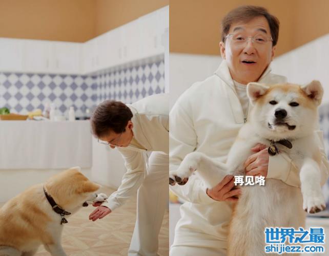 另一个画面里,成龙将一堆小饼干摆在柴犬面前,训练有素的小狗不为所动。等到成龙做出允许的动作后,柴犬飞速进食。