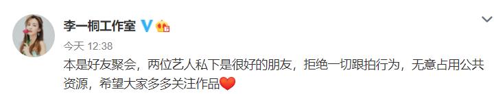 李一桐工作室发文:“本是好友聚会,两位艺人私下是很好的朋友,拒绝一切跟拍行为,无意占用公共资源,希望大家多多关注作品。”