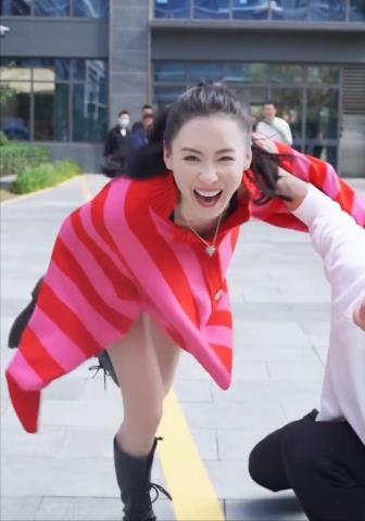 不过,张柏芝往前倾使,单腿站立导致她重心不稳,往前踉跄了一下,差点扑到了贾乃亮身上。贾乃亮赶忙把她接住,自己也跪了下来,两人姿势十分滑稽。不过即使是这样的姿势,张柏芝仍然很美丽。