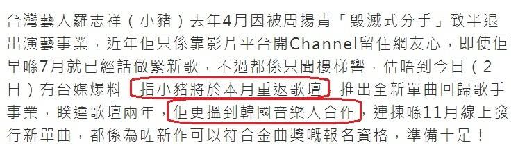 种种情况来看,台媒表示小猪将在本月重返歌坛,到时候他将推出全新的单曲回归他的歌手事业,而且已经观察了两年的歌坛动态,还与韩国某知名音乐人一起合作,会在11月发布线上单曲。