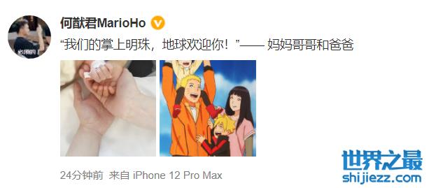 何猷君发文,“我们的掌上明珠,地球欢迎你——妈妈哥哥和爸爸”,除了和奚梦瑶晒出了同张一家四口的牵手照之外,何猷君还特地晒出了一张鸣人与雏田一家四口的照片,委婉地暗示了二胎的性别。