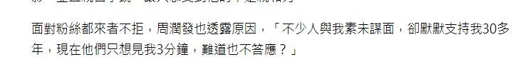 不过另一位网友表示发哥虽然不开心,但他并没有怎么生气,还是用不同的表情与粉丝合影。因为此事获得了媒体的关注,事后周润发也表示其实不少网友与我素未谋面,但他们却一直默默地支持了我30多年,现在他们只想见我3分钟,难道我不答应?
