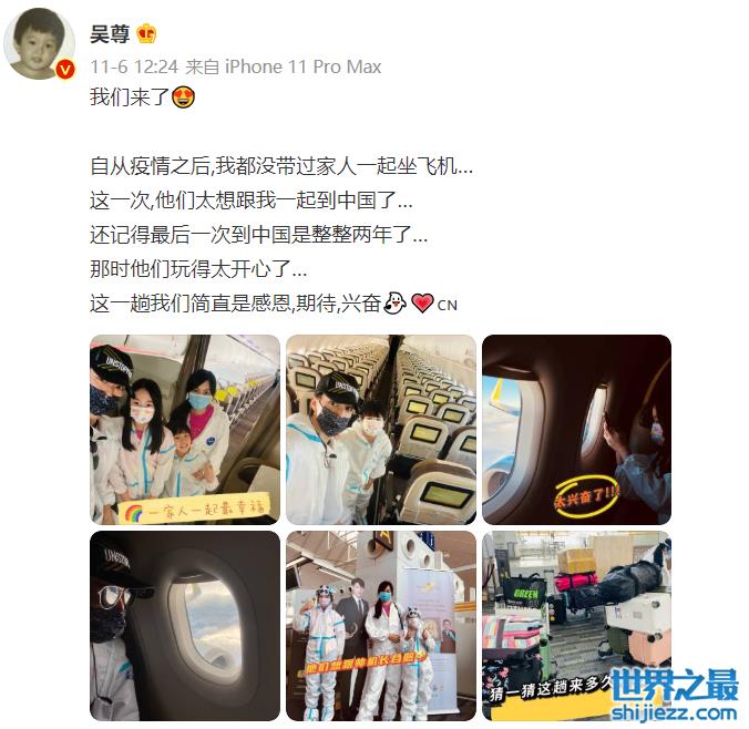 11月6日,吴尊更新社交动态,称自己带家人一行再度来到中国,因为这两年疫情的原因,吴尊一家只好遵循规定一直呆在文莱生活,如今好不容易得到允许,吴尊便迫不及待地带着全家来中国。