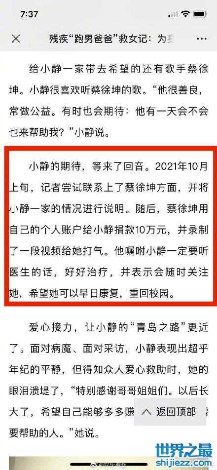 这一位小静的粉丝家庭的确是够难得,就连官网取的标题也是残疾跑男爸爸救女记,为身患16种疾病的女儿追出一道光。小静在获得救助之后,心情激动地感谢蔡徐坤,并且表示谢谢大家的帮助,等自己病好了之后,长大了之后一定会赚更多的钱回报社会。