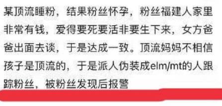 近日,网上流传出了一个大瓜,说是娱乐圈的孩子不定时掉落,一90后顶流男星与一福建粉丝已经秘密生娃,男星不小心,而粉丝非要生下来。粉丝家中非常有钱,其父与男星达成了一致,孩子跟女方,跟男星没有关系。但是顶流男星的母亲怀疑孩子不是男星的,于是找人跟踪了粉丝,后来粉丝报警才使得这件事被外界知道了。