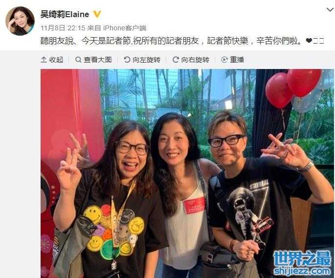 吴绮莉站在C位,配文:听朋友说今天是记者去医院,祝所有记者朋友快乐,辛苦你们啦。露面的吴绮莉感觉整个人的状态非常好,而且少有的在媒体面前露出灿烂的笑容。