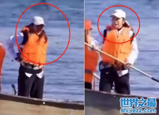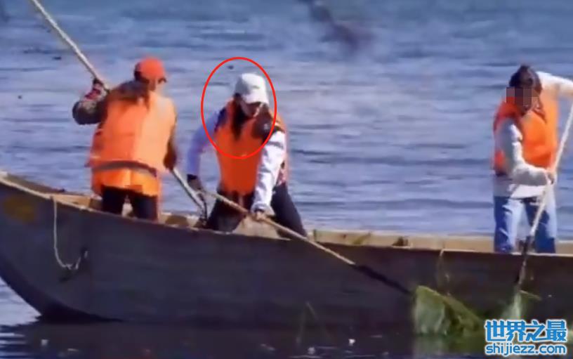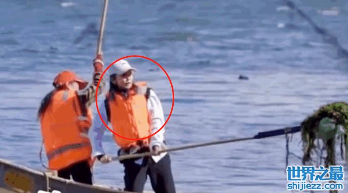 视频里,李冰冰白衬衫配黑色牛仔裤,头戴棒球帽打扮休闲,在船上套了件救生衣安全意识强。只见李冰冰双腿迈开稳住重心,自信满满地用网杆挑起洱海里的水草。