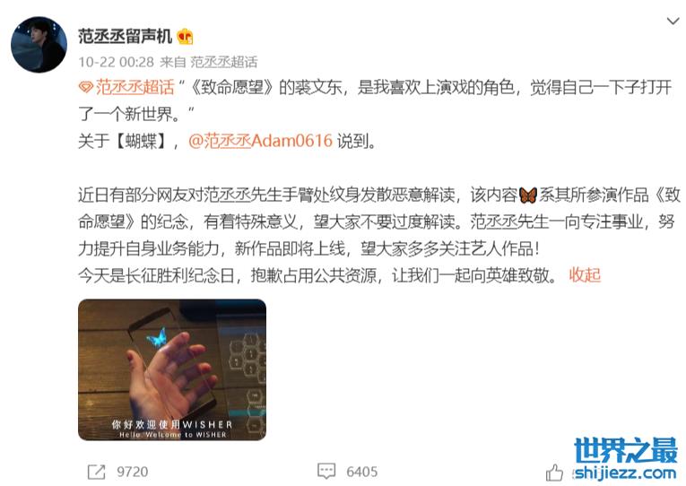 除了蝴蝶之外,还有人总结了范丞丞与欧阳娜娜的同款以及两人“暧昧”的地方,力证他们是偷偷谈恋爱了。对此,范丞丞工作室还专门辟谣,解释了蝴蝶对于范丞丞的特殊意义,是因为饰演《致命愿望》的裘文东而喜欢上了演戏,纹身蝴蝶是为了纪念《致命愿望》。