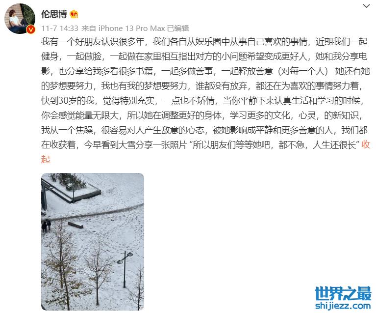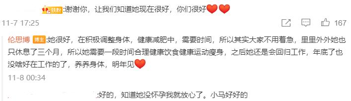 他表示马思纯现在是一个特别平和和充满善意的人,将焦躁的他也影响了,向心态平静转变。在评论区中,伦思博也有回复关心马思纯近况的网友,表示马思纯很好,在健康减肥当中,因为这需要时间,所以大家不要着急。