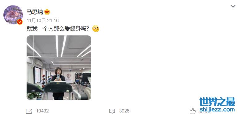 马思纯配文称:“就我一个人那么爱健身吗?”看着空荡荡的健身房,看来这个时间段只有她一个人在锻炼,不过这么调皮发问,真的不怕教练加大训练强度吗?