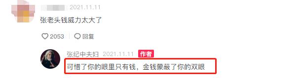 对于两人的恩爱行为,许多人早已司空见惯,但也有少数人仍对他们的爱情有些偏见,留言称:金钱威力太大。实际上对张纪中和杜星霖的感情提出质疑。张纪中直接回怼称你的眼里只有金钱看不见美好的事物。