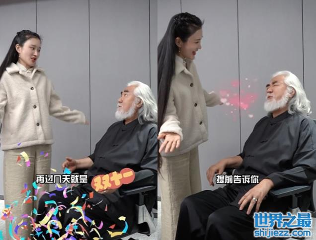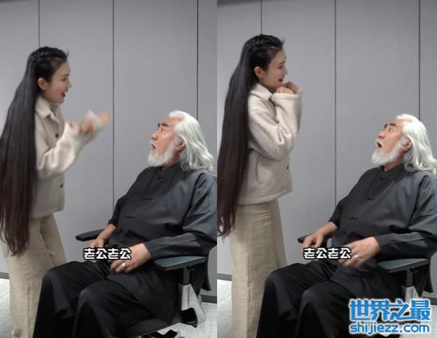 张纪中身穿一套黑色休闲服,悠闲地坐在椅子上。站在一旁的娇妻则身穿棉衣披散秀发,对着丈夫做出扭腰握拳极为娇羞,语气软糯呼喊着老公。