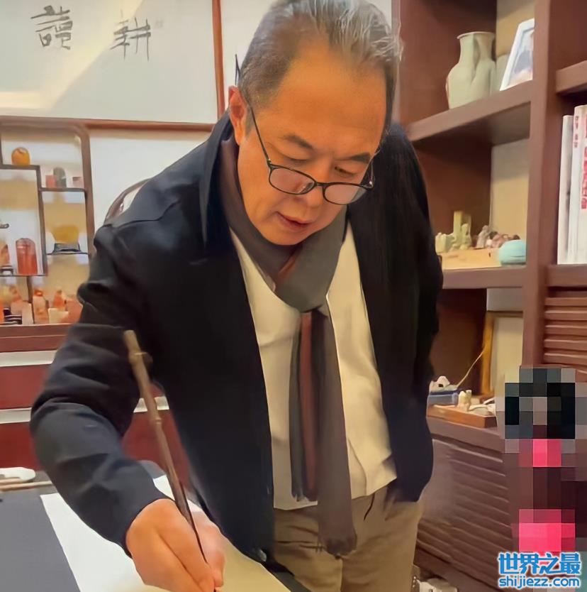 64岁张铁林书房里练字!头上扎小辫肚腩突出,满屋堆满书画显拥挤 ...