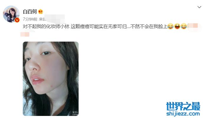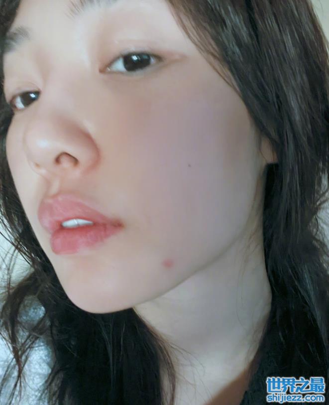 镜头里的她皮肤干净白皙,面色红润,几乎毫无瑕疵。不过下巴右边一颗红色的痘痘却十分显眼,她自己也不禁说道,对不起自己的化妆师。并打趣道:“这颗痘痘可能实在无家可归,不然不会在我脸上。”也是十分幽默了。