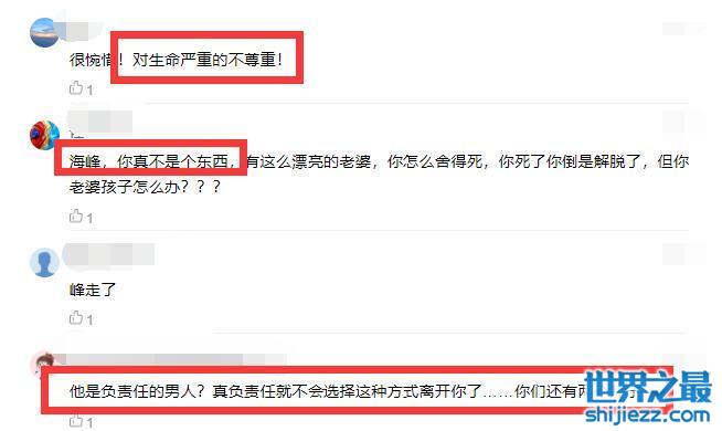 甚至有些网友对海峰非常不尊重,说:“海峰,你真不是个东西,这么漂亮老婆,怎么舍得死”,“对生命严重的不尊重”,还吐槽海峰不是个负责任的男人,抛弃妻子和两个儿子。