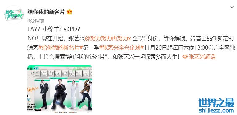 张艺兴的新综艺《给你我的新名片》,即将在11月20日起每周六晚18点播出,“新名片”、全新身份,这一切都预示着张艺兴将在综艺当中解锁各种新身份,呈现出前所未有的全新体验。