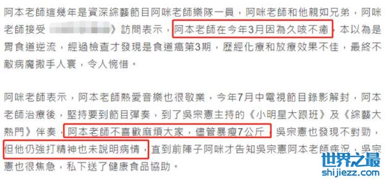 据了解,陈本恩在今年三月时,一直咳嗽,本来以为是胃食道逆流,但是到医院检查出食道癌三期。到了七月份他做完手术后,立马投入到工作中,参与到了吴宗宪主持的《小明星大跟班》和《综艺大热门》的录制,因为治疗的缘故,他暴瘦了14斤。