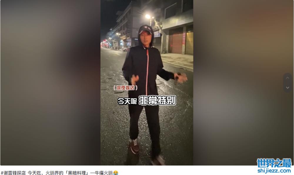 画面中谢霆锋戴棒球帽,身穿一套黑色运动服十分单薄,边行走边介绍今天探店的终点。最后他来到店面前,正式公开自己的宵夜是牛瘪火锅。