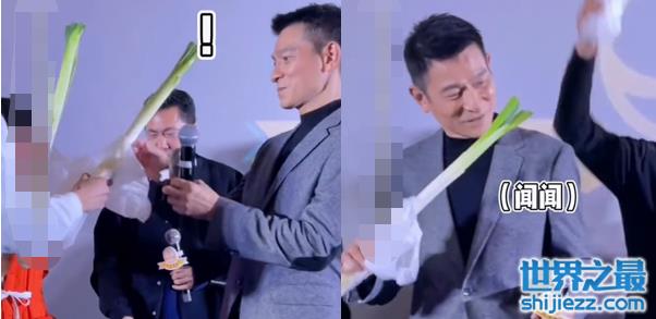 有粉丝为刘德华送上几根山东特产——几根巨大的大葱。粉丝将大葱递给刘德华,刘德华一脸震惊,但还是接过左看右看,还闻闻大葱的味,也是非常可爱了。