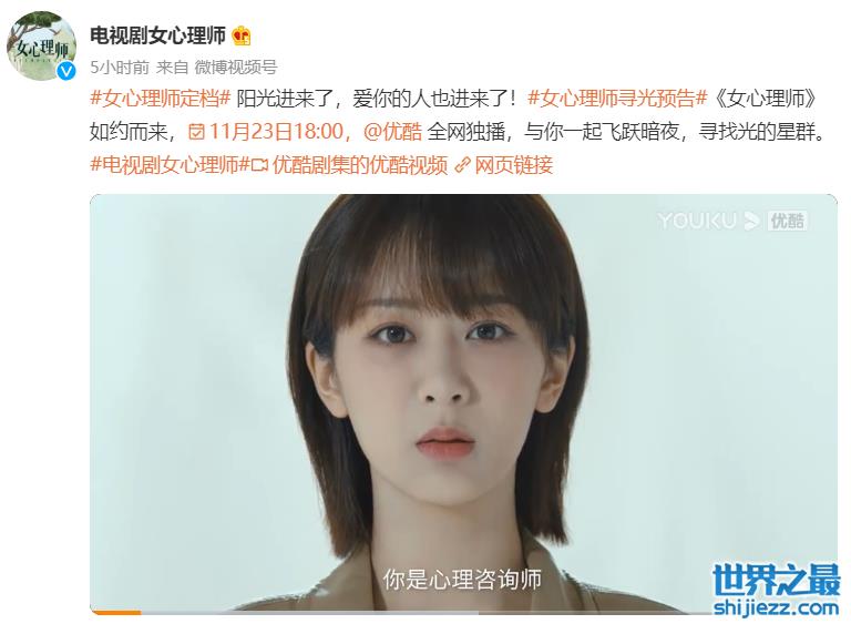 11月16日,电视剧《女心理师》正式官宣定档,该剧将于11月23日18点首播,官博官宣了定档的消息,并且发布了该剧的预告。