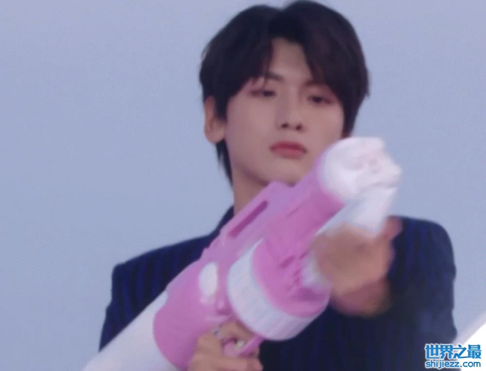 翟潇闻拿着把巨大的粉色水枪,一路折腾想把水挤出来,但是一直没成功,红毯快走完了,水枪才出水。