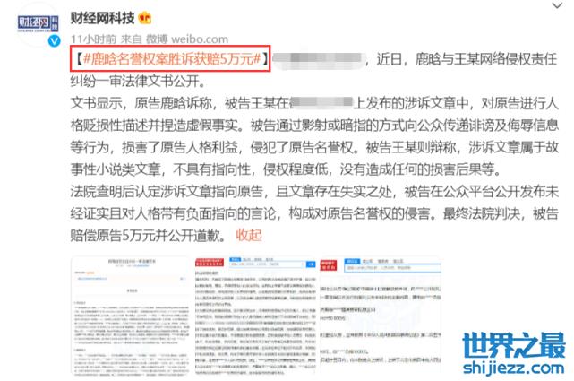 据报道称,鹿晗名誉权胜诉的判决文书在近日已公开,文书中显示,原告鹿晗诉称,被告王某发布的《京圈格格与现男友谈合约恋爱的内幕》一文中,对他进行人格贬损描述并捏造虚假事实,最终判决鹿晗胜诉,王某将赔偿鹿晗五万元并公开道歉。