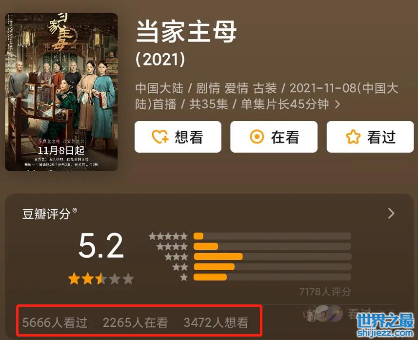 还有刘涛和林峰的《星辰大海》,于正的新作《当家主母》评分都在5分左右,虽然两部剧都有一定热度和话题,但争议不少。而且从豆瓣的资料来看,观看人数和评分人数都不多,只有几千人。