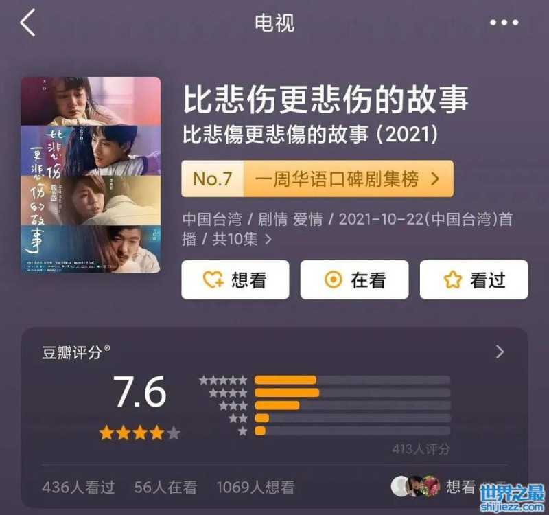 第三部是《比悲伤更悲伤的故事》,评分是7.6分,这部剧的争议比较大,因为有网友觉得这部剧观看人数很少,只有几百人,所有评分不是很客观。