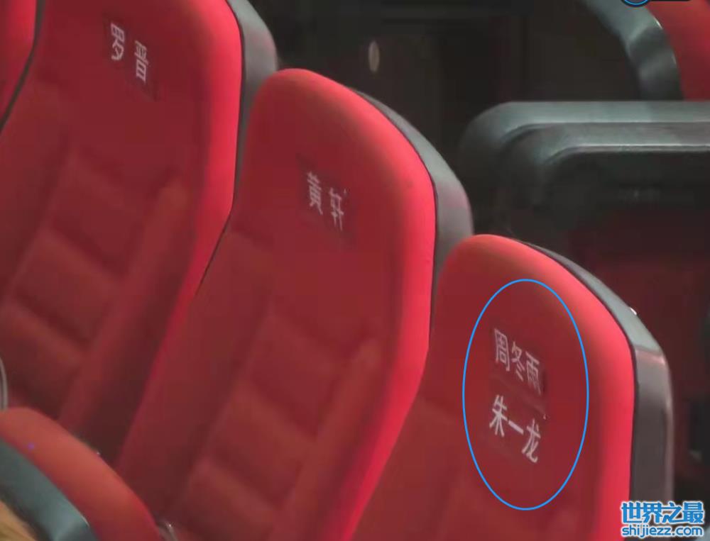 这个座位原本安排的是周冬雨,座位上也贴有周冬雨的名字。可这个座位就是如此奇怪,竟同时贴了两个人的名字,周冬雨的名牌与其他嘉宾名牌高度一致,朱一龙的名牌更像后贴上去的。
