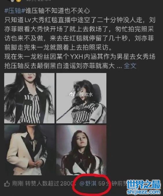 随后舒淇半夜的点赞,内涵得就更明显了,刘亦菲的粉丝发博解释称刘亦菲在20分钟上场是为救场,并且指责朱一龙粉丝。这条微博下面,明晃晃地挂着舒淇的点赞。并且舒淇很长时间没有取消这个点赞,网友排除“手滑”这一项原因。