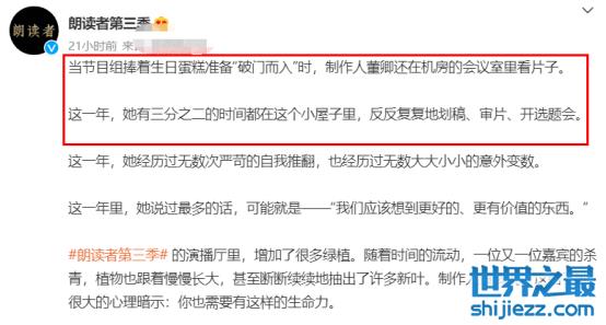 在这间小小的会议室,承载了董卿过去一年的大部分时光。在朗读者的配文中提到,她有三分之二的时间都在这个小屋子里,反反复复地划稿、审片、开选题会。当节目组捧着生日蛋糕准备“破门而入”时,制作人董卿还在机房的会议室里看片子。其非同一般的敬业,只是为了呈现更好的作品。
