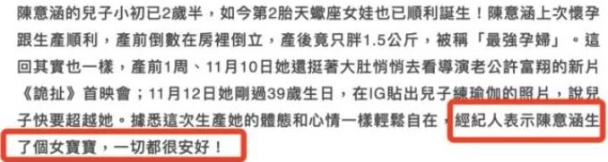 11月16日,台媒透露,陈意涵已于近日顺利产下二胎,一枚可爱的小公主。