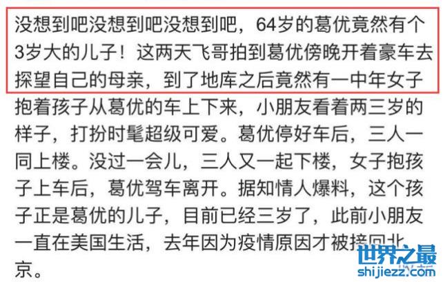 在感情方面,葛优与妻子贺聪很早就结婚了,不过婚后一直没有生孩子,葛优在出名之后也没有抛弃“糟糠发妻”,反而是对她更加尊重和爱护。不过近来有媒体多次拍到葛优、贺聪与一个小孩同框的画面,有消息称这是葛优一直养在国外的儿子,因为疫情才接回到国内的,但是葛优方面并没有对此进行过任何回应。