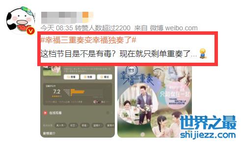 对此有网友也直言,《幸福三重奏》节目“有毒”,“三重奏”已经变成了“独奏”,还有网友调侃“这个节目的导演堪称拆婆,人中之拆”。
