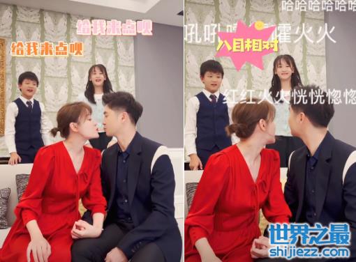 就在两人沉浸在甜蜜氛围时,女儿田雨橙和儿子田宸羽突然从沙发背后窜出,一脸笑意地对着父母嚷着“哪里有糖给我来点呗”。田亮和老婆则是一脸错愕转头,看着一对子女略显无奈,火热场面秒变尴尬。