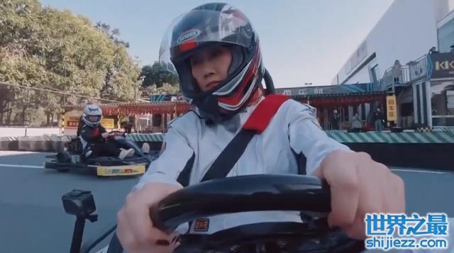 她还带着主持人去玩了卡丁车,戴着头盔,一路冲在前面,非常酷飒。