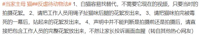 有网友提出,白猫容易被替代,不需要它现代的视频,只要当时的拍摄花絮,希望将工作人员用绳子扯猫咪后腿的花絮发出来,希望将猫咪拍完毒死画面后站起来的花絮发出来,剧组的回应中无法判断是拍摄前还是拍摄后的状态。