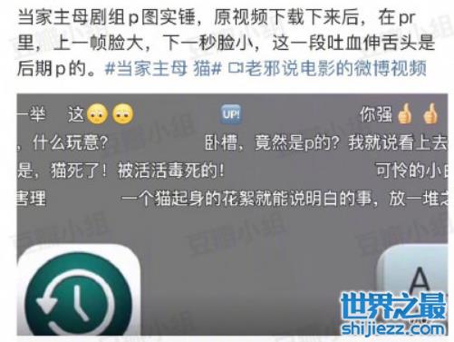 更有网友下载了剧组回应用到的视频,结果在PR里面,上一帧脸大,下一帧脸小,严重怀疑小猫吐血伸舌头是后期P的。