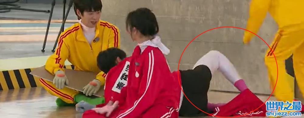 在秦霄贤艰难的操作下,红色运动裤逐渐脱下,露出白色紧身打底裤和粉紫色的袜子,姿势十分滑稽。这一出意外的操作顿时将综艺效果直接拉满了。