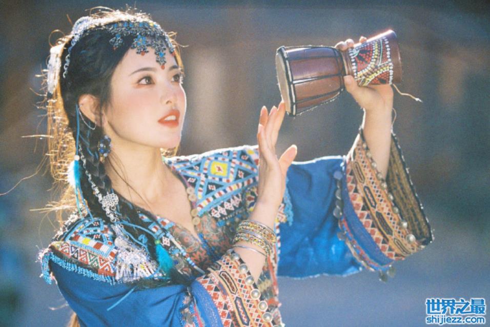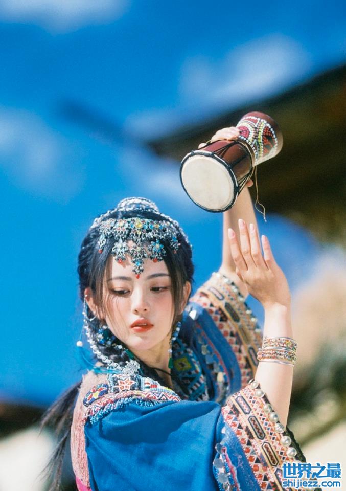 在这次的的服饰中,虽然十五张照片都是差不多的服饰,但是却配有不一样的民族道具,显得格外有趣。